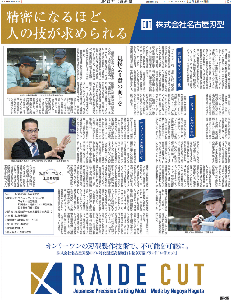 A full-page ad was published in the Nikkan Kogyo Shimbun Newpapers about Raide Cut